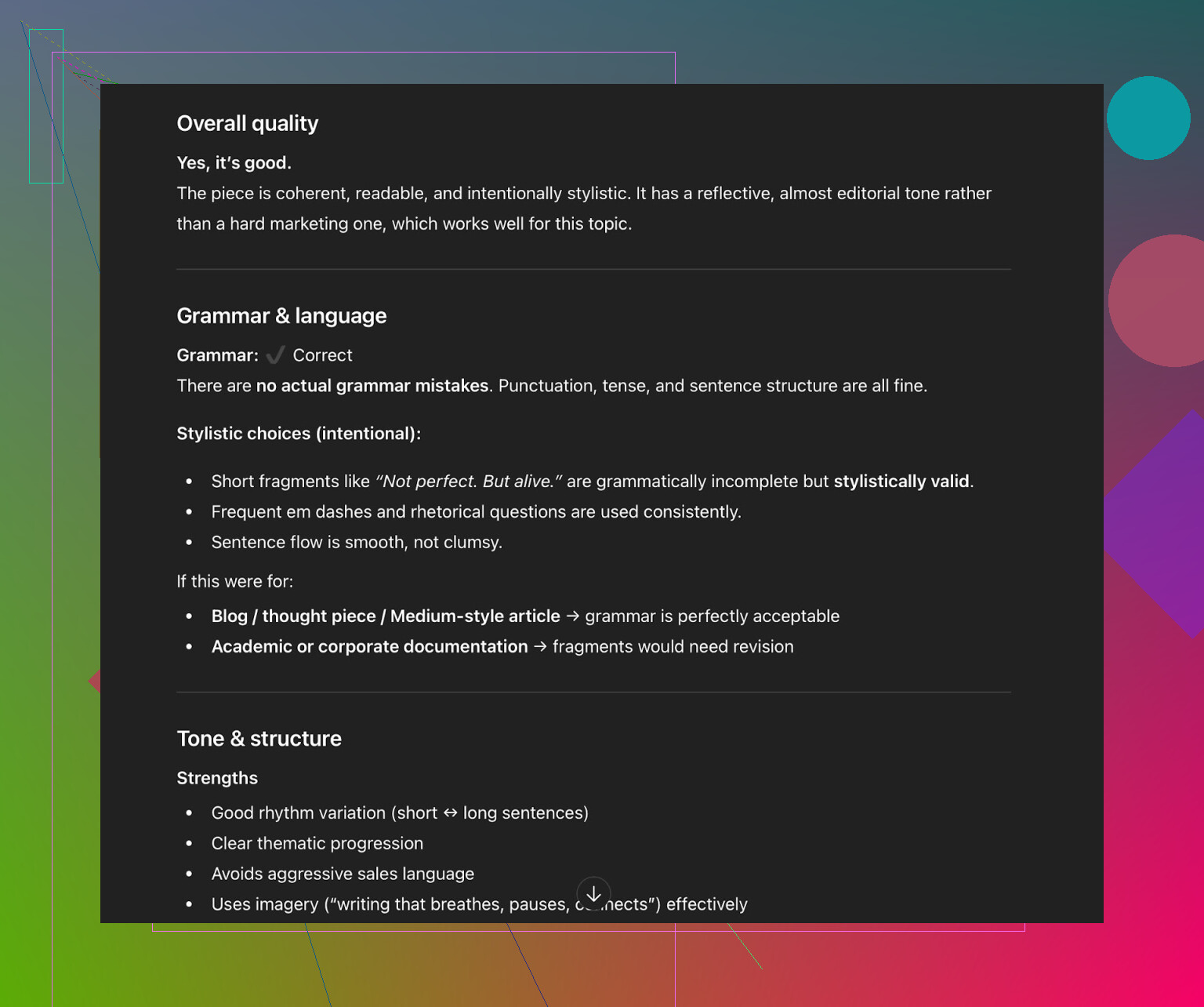 Jeśli twoja marka ma mocny, wyrazisty głos, będziesz musiał/a ręcznie to z powrotem dołożyć. Tu znów trochę różnię się od @mikeappsreviewer: nie opublikowałbym 3‑tysięcznego filara po jedynie szybkim przejrzeniu tekstu po przepuszczeniu przez narzędzie.