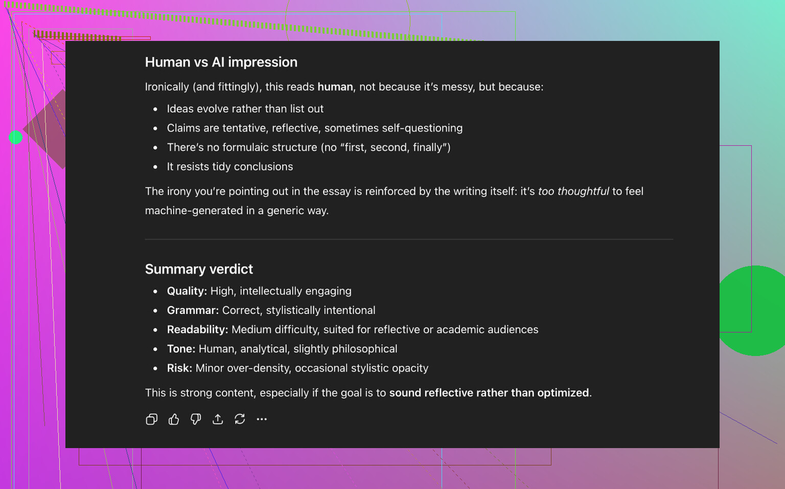 „Przeanalizuj ten tekst pod kątem jakości, gramatyki i tego, czy brzmi jak napisany przez człowieka.”