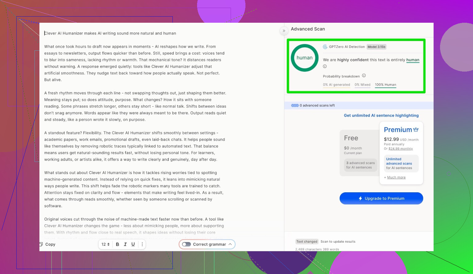 - Więc jeśli ktoś próbuje pobierać opłaty „za Clever AI Humanizer”, to prawie na pewno jest to zupełnie inna usługa jadąca na tej nazwie