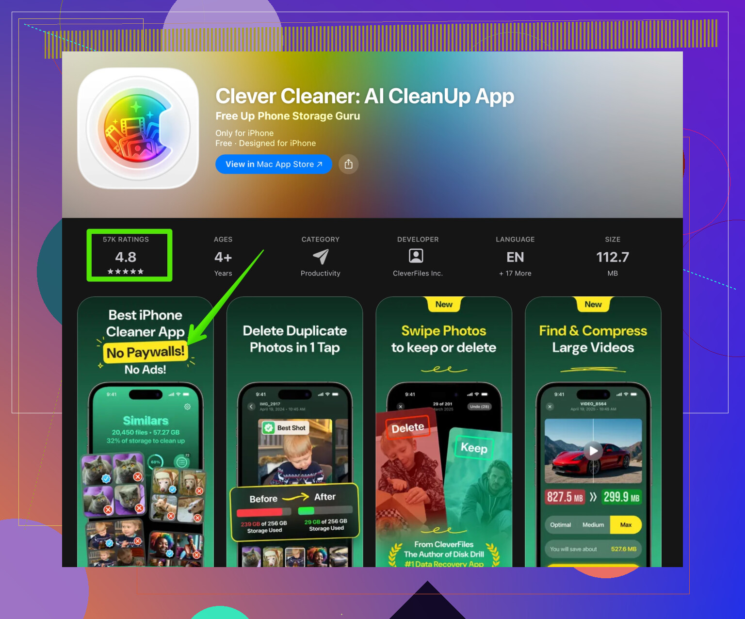 For cleaning clutter like duplicate photos, bursts, and random junk files, a storage tool helps. The Clever Cleaner App is useful here because it focuses on: