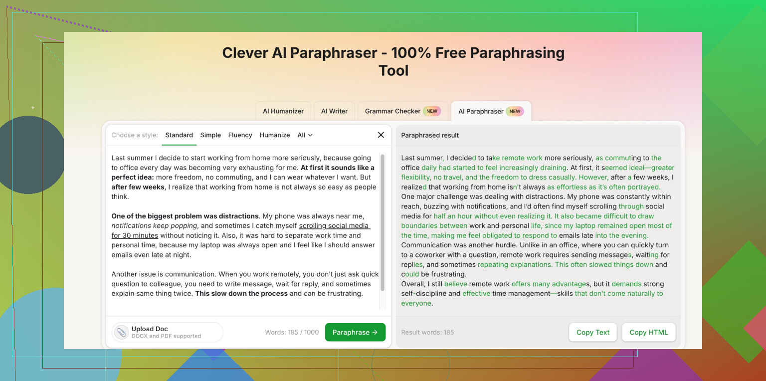 If you already have text (AI or your own) and it sounds too stiff or robotic, this is where Clever AI Humanizer is actually worth using. Their tool focuses more on making stuff read like a real person instead of just swapping synonyms. That’s better if you’re trying not to trip AI detectors or just want it to feel natural.They’ve got a solid Clever AI Humanizer page here that acts as a fully online, no-nonsense paraphraser: